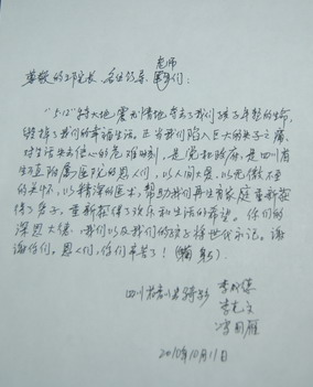 “5.12”特大地震无情地夺去了我们孩子年轻的生命。对生活失去信心的危难时刻,是党和政府,是四川省生殖健康研究中心附属生殖专科医院的恩人们,以人间大爱,以无微不至的关怀,以的医术,帮助我们在生育家庭重新获得了爱子,重新获得了欢乐和生活的希望。你们的深恩大德,我们以及我们的孩子将世代永记。谢谢您们。恩人们,你们辛苦了!