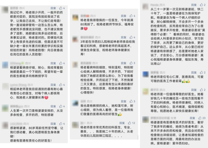 从四川大学华西第二医院二次荣休后,杨教授并未停下行医脚步,受邀在四川省生殖专科医院建立 “杨延林教授团队”,每周二下午定期坐诊,为有需求的患者提供“华西水准”的精准诊疗,全力解除疑难病痛;同时,毫无保留地为医护人员传道授业解惑,助力医院整体诊疗水平的提升。团队核心成员左玉芳更是耳濡目染,与杨教授形成了高度默契。目前,团队以高水平的医疗服务和严谨的诊疗规范,收获了就诊患者的普遍好评。